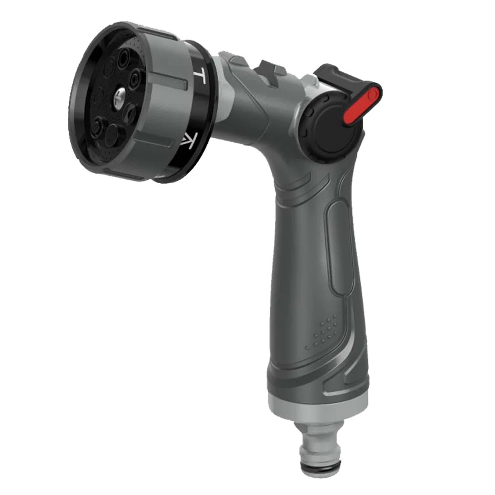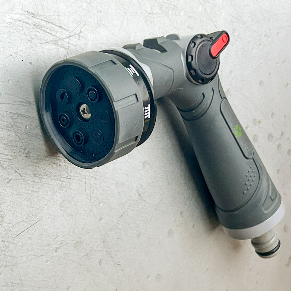 Unser GreenX Highline 7-Wege Metall-Brause Click SB ist eine Bewässerungsbrause in Profiqualität. Sieben unterschiedliche Strahleinstellungen bzw. Sprühbilder ermöglichen optimale Einstellung für jede Situation: durch Drehen des vorderen Brauseteils lassen sich komfortabel Einstellungen von starkem Strahl für Autowäsche oder Terrassensäuberung, über diverse Beregnungseinstellungen für die Planzenbewässerung bis hin zu Sprühnebel vornehmem. Eingedruckte Symbole auf dem vorderen Brauserad erleichtern die schnelle Wahl und Einstellung des erwünschten Sprühbilds. Und damit die Gartenarbeit auch länger am Stück Spaß macht, liegt die Brause dank des ergonomisch geformten Griffs perfekt in der Hand. Durch das oben liegende Drehrad kann der Wasserfluss dabei jederzeit stufenlos eingestellt werden. Der Brausekörper ist aus Metall hergestellt und verspricht damit hohe Langlebigkeit selbst unter härtesten Einsatzbedingungen.